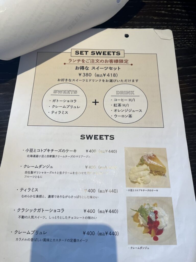 パスタ、ピザ、ハンバーガー、サンドイッチ、ビーフ、フィッシュ、とたくさんの種類の中から好きなものを選ぶことができます!スイーツセットはお好きなスイーツ+お好きなドリンクで418円(税込)ととてもお得です🍰